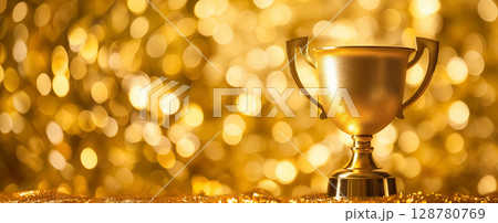 Golden trophy cup on wooden table with falling confetti and glowing spotlight celebrating victory and achievement
