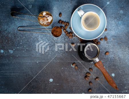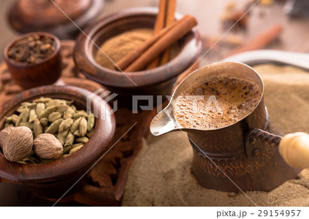 Turkish coffee cooked in sand or maker cezve with coffee bean on green