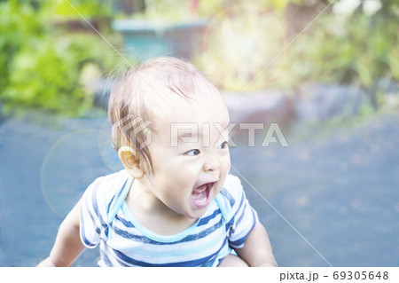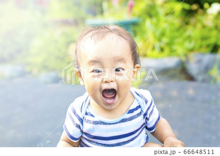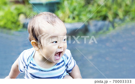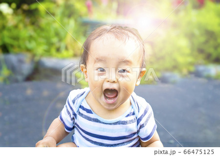 外で大声で叫び大興奮している子供 水遊びしてずぶ濡れの子供 ガオー
