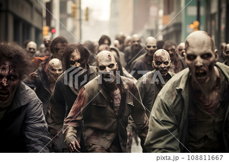 group of zombies walking on city street at day time, neural network generated photorealistic image
