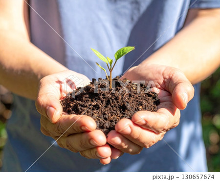 水彩風 手のひらで苗木を優しく育てるイラスト