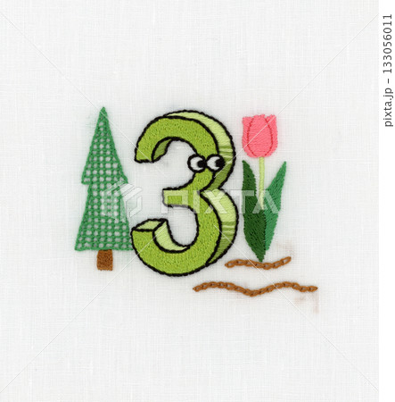 4の数字とレンゲとクローバーとシロツメクサの刺繍