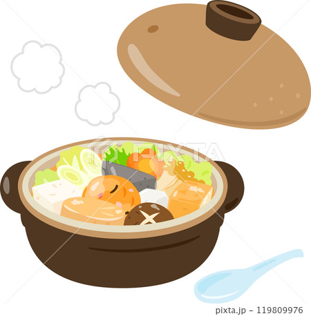 小型の土鍋の蓋をしたイラストと蓋を取ったイラスト