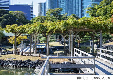 東京 中央区 浜離宮恩賜庭園 潮入の池とお伝い橋の藤棚