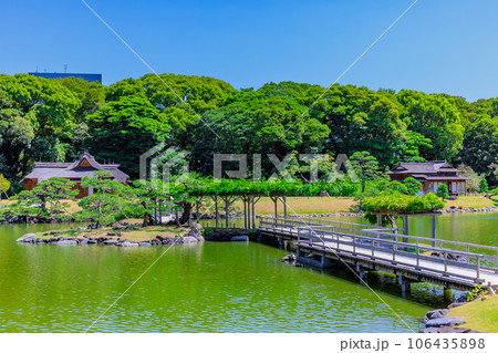 [東京・汐留] 浜離宮恩賜庭園の潮入の池を渡すお伝い橋と燕の御茶屋の風景。