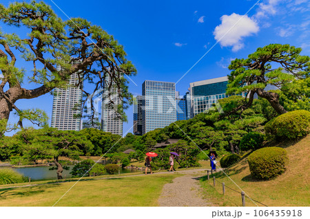 東京 中央区 浜離宮恩賜庭園 松の木と高層ビル
