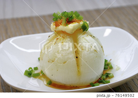 丸ごと新玉ねぎのホイル蒸し バターとフライドオニオンと小葱のせて