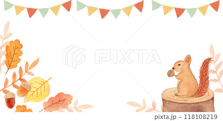 北欧風オシャレで楽しい秋の植物や森の動物の白バックフレームのイラスト