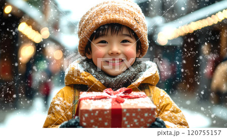 雪の降る中、クリスマスプレゼントを持って喜ぶ男の子