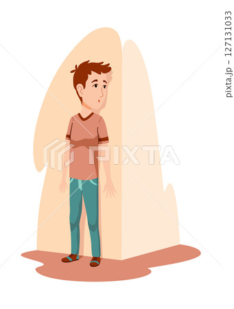 Kid playing hide and seek. Playing game outdoor in summer vacations. Boy having fun outdoors, summer playtime. Vector cartoon illustration
