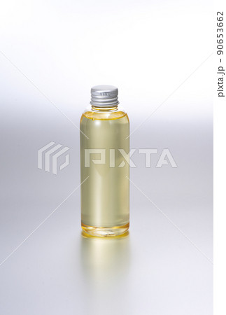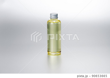 黄色い液状化粧品が入ったシルバーの蓋のプラスチックボトル
