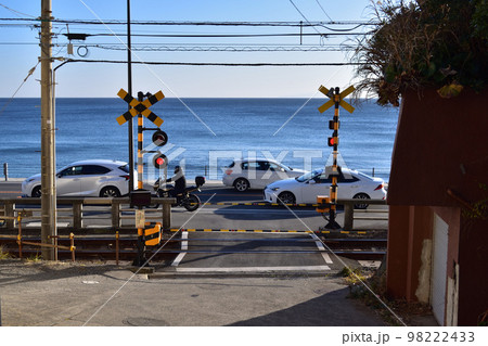 鎌倉・腰越の江ノ電の踏切と相模湾