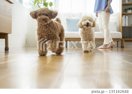 家の中で走る2匹の小型犬(トイプードルとビションプー)