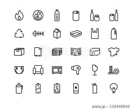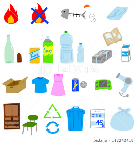 ゴミの分別用アイコンセット イラスト 燃えるごみ 燃えないごみ 不燃 可燃 プラ カン ペットボトル