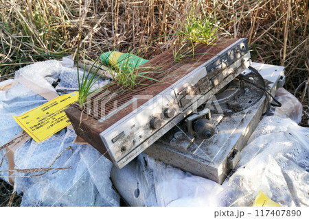 河原に不法投棄されたレコードプレーヤー・オーディオアンプ・家電