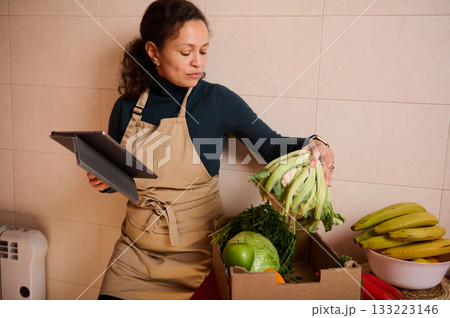 Woman In Apron Checks Groceries With Tablet In Kitchen, Stocking Fresh Produce At Home