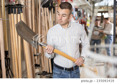 Amateur gardener man selects necessary items tools for her hobby in greenhouse flower-bed