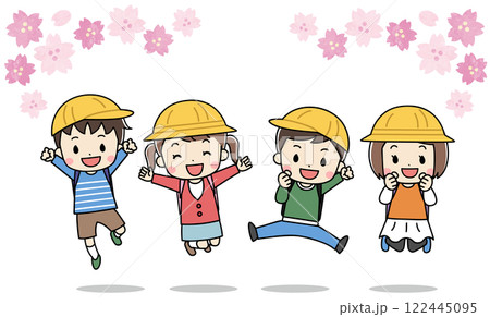 春にランドセルを背負った子供たちと桜のイラスト