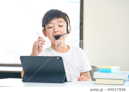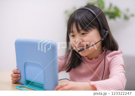 ヘッドセットをつけてパソコンでオンライン学習をする小学生の女の子