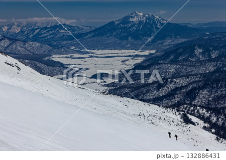 残雪期の至仏山稜線から見る尾瀬ヶ原と燧ヶ岳