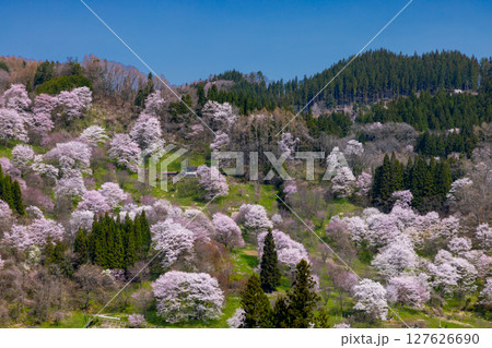 長野県上水内郡小川村高府 斜面一面にオオヤマザクラやエドヒガンなどが咲く二反田の桜