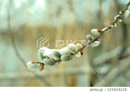 Spring willow branch covered with snow.