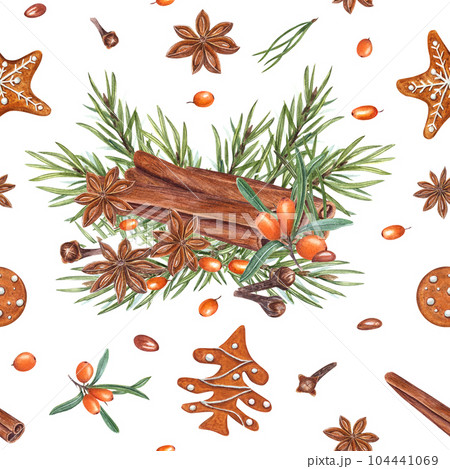 Watercolor seamless pattern of Xmas composition isolated on white background. Botanical illustration with orange berries, cinnamon sticks, gingerbread cookie, spruce branch, cloves, anise