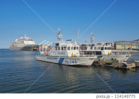 小樽初寄港のクルーズ客船リビエラと巡視艇やぐるま