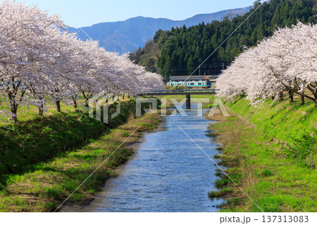 鳥羽川の桜並木に迎えられる小浜線の気動車