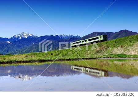水鏡になった田んぼの築堤を行く小海線のディーゼルカーキハ110 甲斐駒ヶ岳