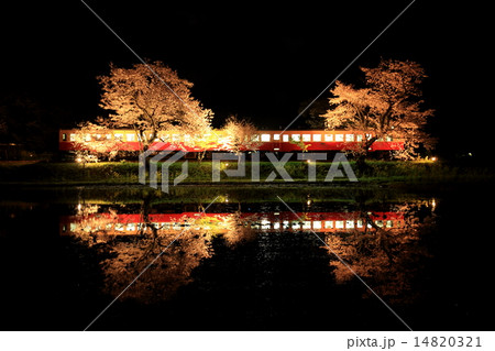 桜と列車の田んぼリフレクション 小湊鉄道 飯給駅