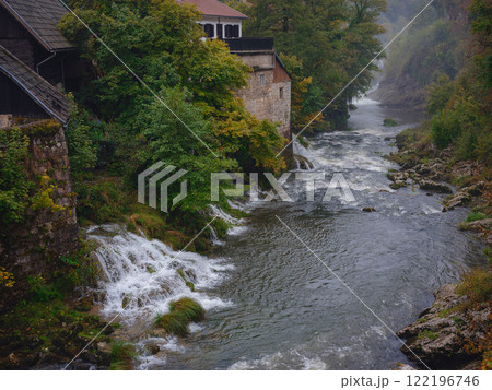 Travel to Village of Rastoke near Slunj in Croatia. Breathtaking view old water mills on waterfalls of Korana river, beautiful countryside landscape