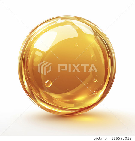 3d gold liquid oil vitamin drops with air bubbles. Serum, collagen gel or essence droplets. Cosmetic yellow transparent balls of hyaluronic acid, beauty product for skin and hair care. 3D illustration