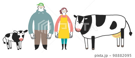 若い酪農家夫婦と乳牛の親子 セットイラスト素材