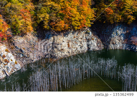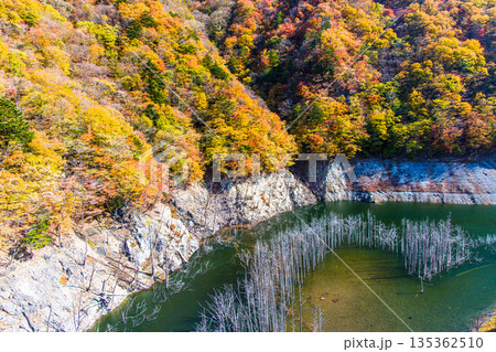 【栃木県_奥日光】湯西川ダム湖の紅葉と白い小立 11月