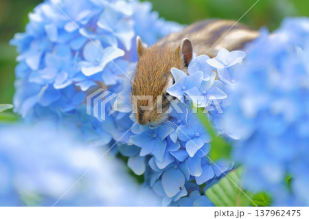 青い紫陽花の中から顔を出すシマリス 癒しのクローズアップ
