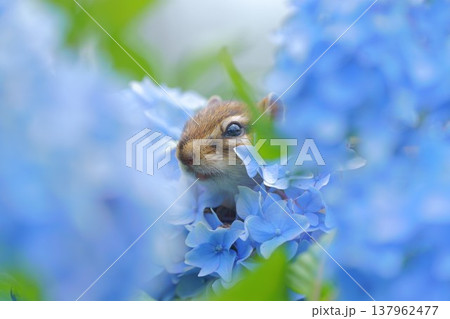 紫陽花に包まれるシマリス 可愛い小動物の癒しの風景