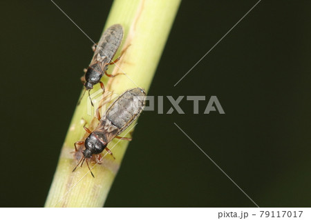 生き物 昆虫 コバネヒョウタンナガカメムシ、イネ科植物に集まる。斑点米を作る稲の害虫