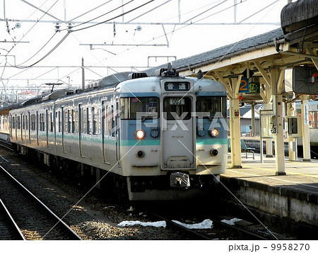 冬の牟礼駅に停車中の北しなの線115系(湘南色)