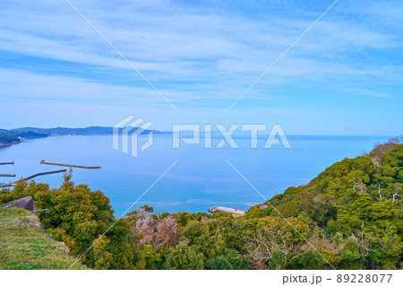 春の兵庫県洲本市の洲本城跡の展望台から淡路島北側を見る