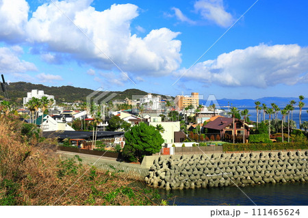 春の兵庫県洲本市の大浜海岸から北側の洲本港方面を見る