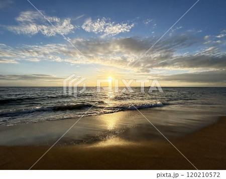 砂浜に打ち寄せる波と夕日の風景