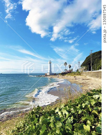 白い灯台と砂浜に打ち寄せる波