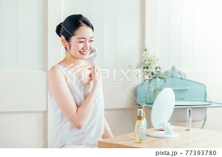 美顔器でマッサージする若いアジア人女性(スキンケア・リフトアップ)