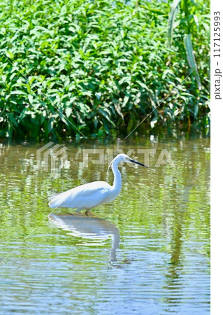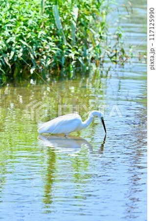 野鳥のコサギ。夏の河川で餌を探すコサギ。