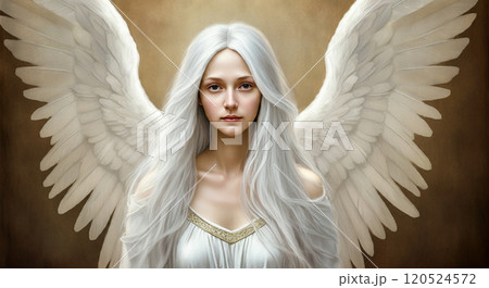 Illustrated depiction of an angel with golden hair, halo, and white wings.