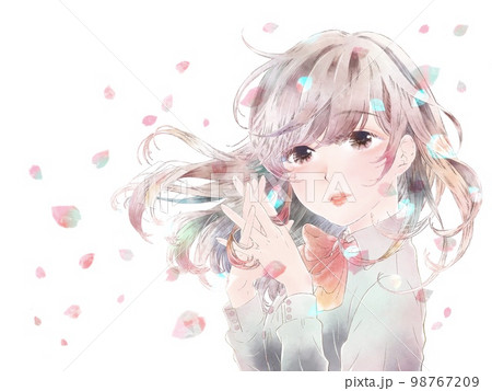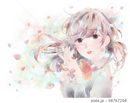 胸の前で手を組む少女/無表情/サクラ/パステル背景