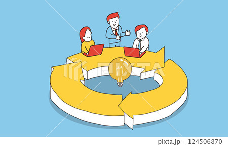 矢印型のテーブルで仕事するビジネスマン 少人数で仕事を回す効率化のイメージイラスト