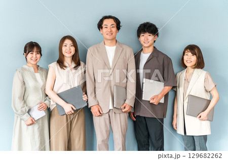 オフィスビルのロビーに整列する笑顔のビジネスパーソンのグループ
