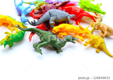 Plastic dinosaur toys on white background